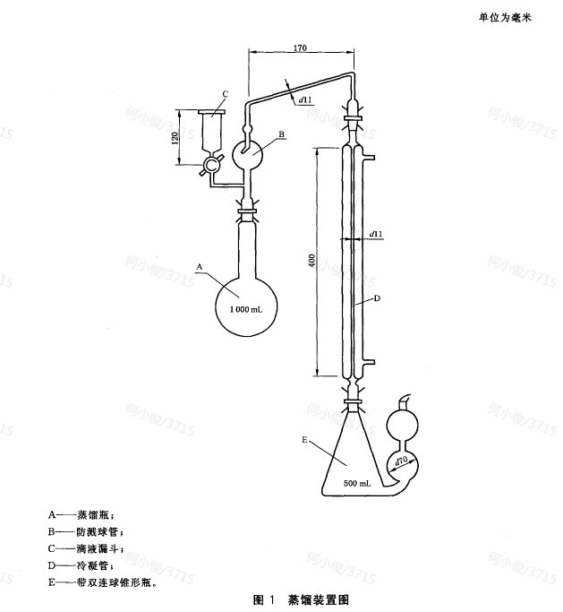 蒸餾加熱裝置:1000W~1500W電爐,置于升降臺(tái)架上,可自由調(diào)節(jié)高度。也可使用調(diào)溫電爐或能夠調(diào)節(jié)供熱強(qiáng)度的其他形式熱源。